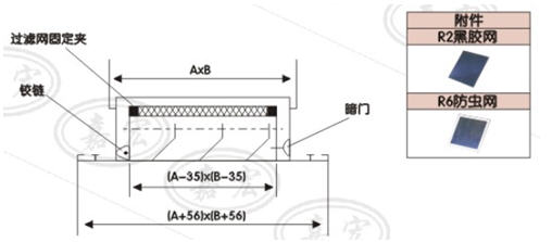 特性  葉片為百葉式設(shè)計,葉片具有防水,內(nèi)框與外框利用鉸鏈連接,內(nèi)框裝有過濾網(wǎng),方便更換或清洗。